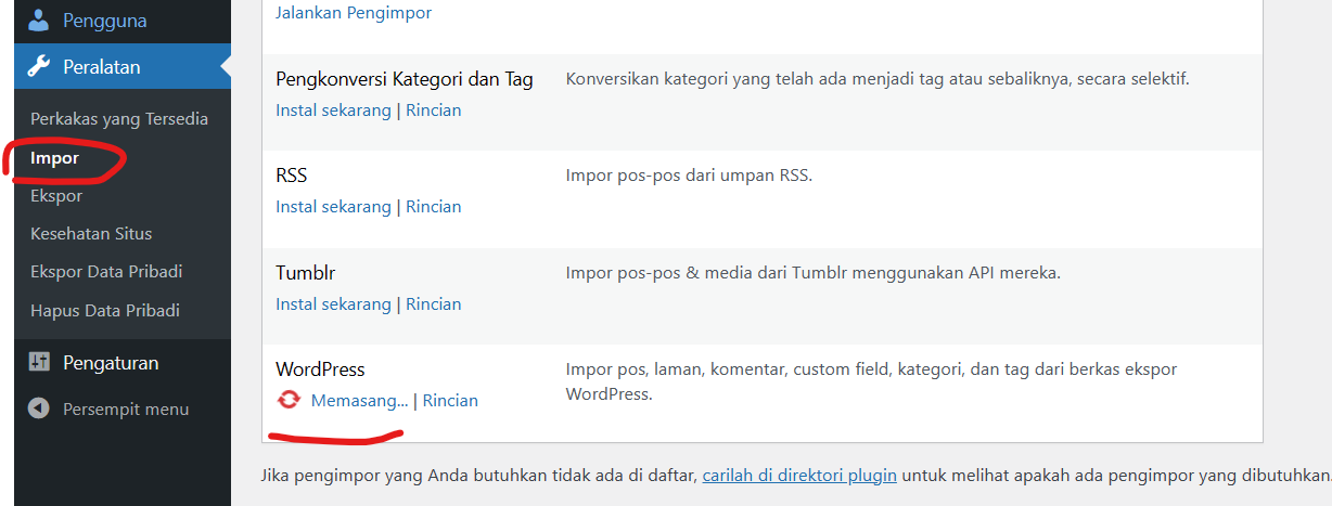 3. Masuk ke dashboard wordpress, lalu ke menu Peralatan – Import