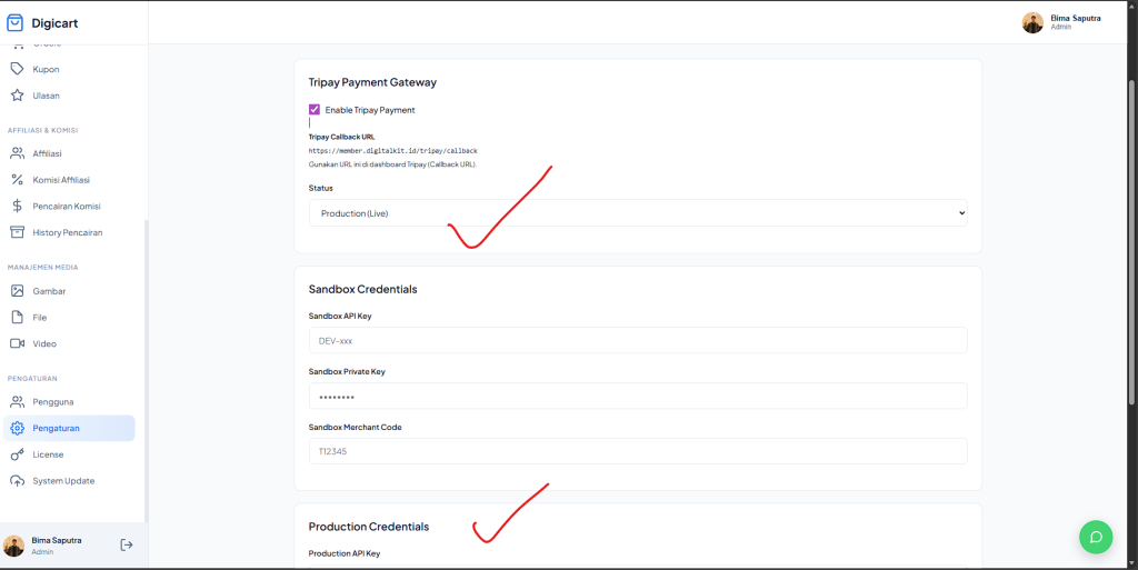 Masuk ke pengaturan Digicart – Tripay, klik enable dan pilih Production, lalu masukan API key, secret key, dan merchan kode:
