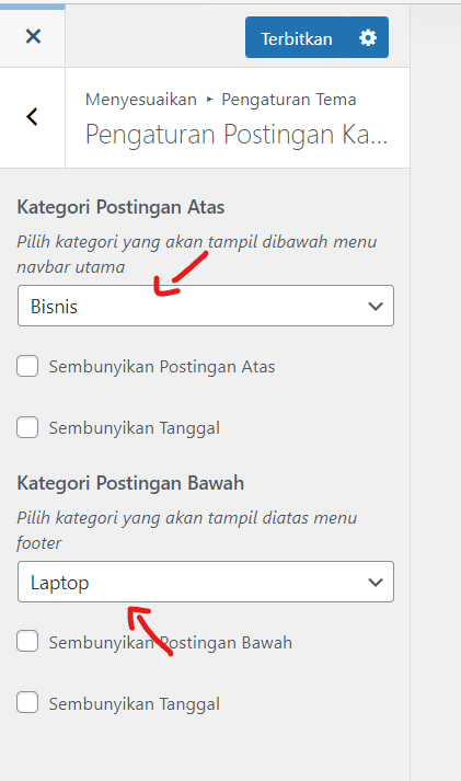 Post bagian bawah menu navbar dan atas footer bisa kita sesuaikan dengan kategori tertentu, berikut panduannya: