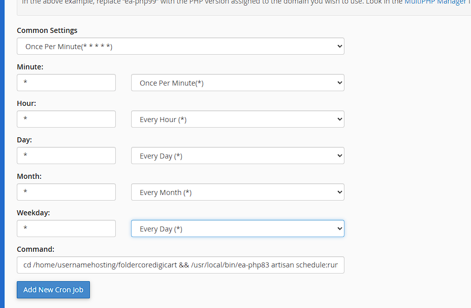 2. cd /home/usernamehosting/foldercoredigicart && /usr/local/bin/ea-php83 artisan schedule:run >> /dev/null 2>&1